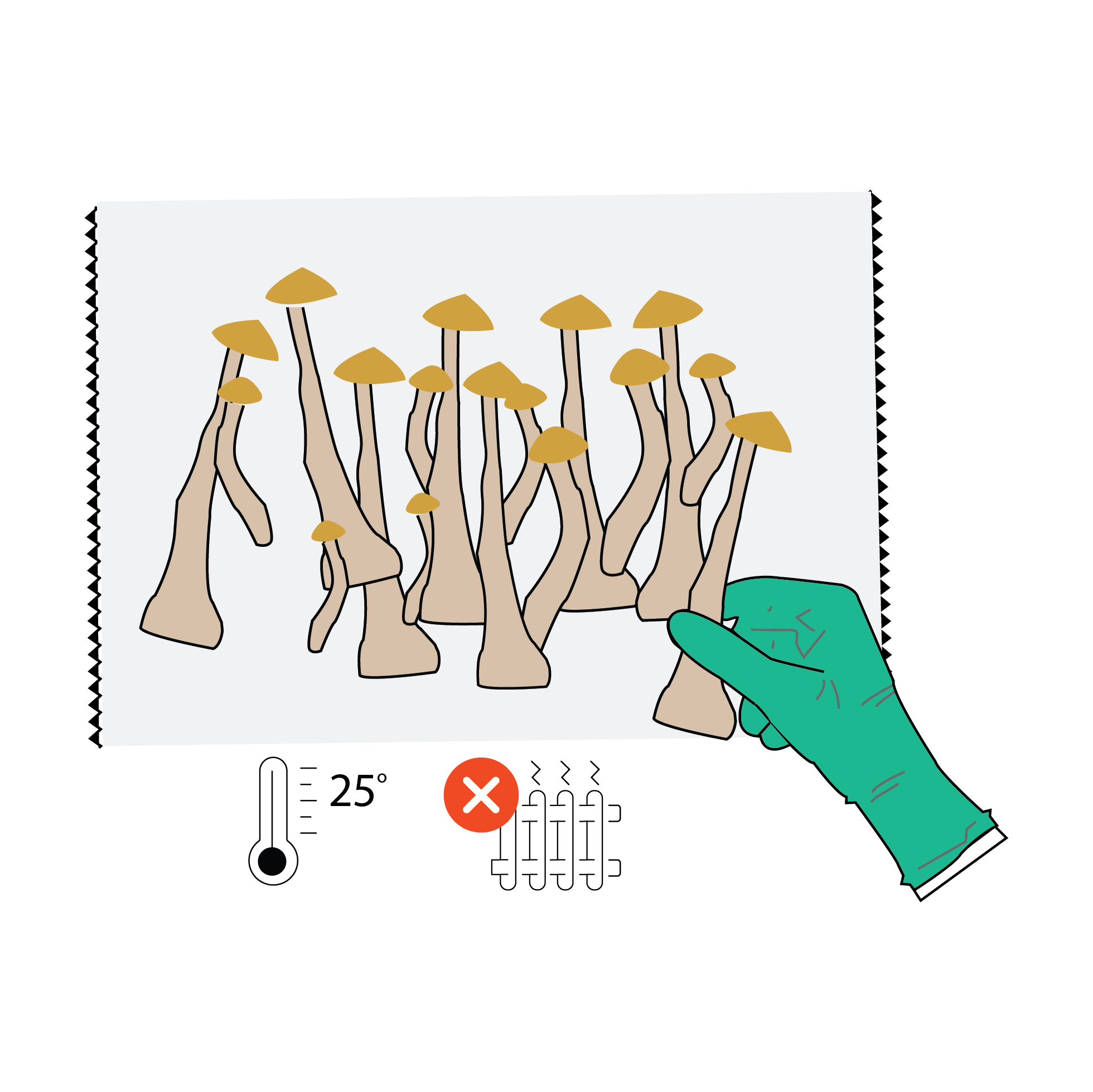 Der Gebrauch von Pilzzucht-Kits ist denkbar einfach. Wichtig ist, dass die Temperaturen um die Growbox mindestens 20 und maximal 25 °C betragen. Anderenfalls könnte sich das Pilzwachstum verlangsamen oder Deine Ernte kleiner ausfallen. Zudem solltest Du sehr sauber arbeiten. Das Pilzmyzel ist äußerst empfindlich und darf keinesfalls mit Bakterien kontaminiert werden. Deshalb wasche und desinfizierte vor der Arbeit mit dem PILZZUCHTSET immer Deine Hände. Achte außerdem darauf, dass die Growbox nicht in direktem Sonnenlicht steht. Sonst bestünde die Gefahr, dass Deine Zauberpilze austrocknen.